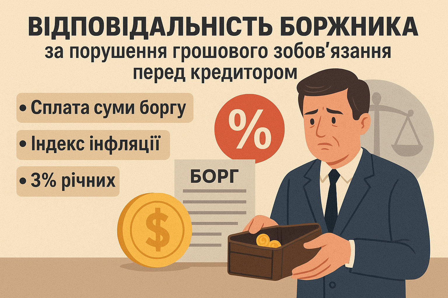 Боржник (фізична особа) у цивільно-правових відносинах з кредитором несе відповідальність за своєчасне виконання грошового зобов’язання. Згідно зі ст. 625 Цивільного кодексу України, «боржник не звільняється від відповідальності за неможливість виконання ним грошового зобов’язання». Іншими словами, навіть у випадку форс-мажору чи інших обставин, які унеможливили платіж, боржник залишається відповідальним перед кредитором.